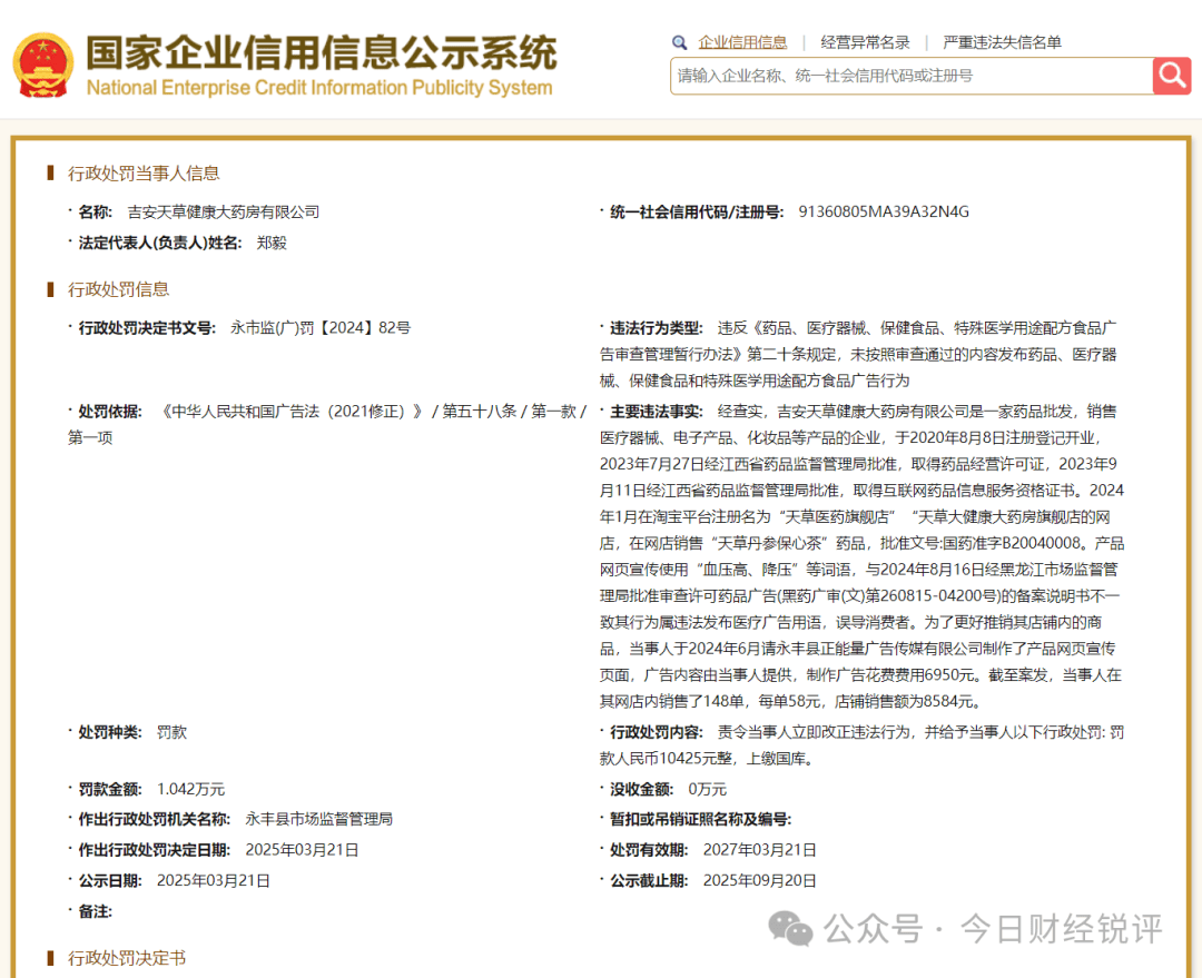 2025年03月21日永丰县市场监督管理局行下达{永市监(广)罚【2024】82号}行政处罚决定书。对当事企业吉安天草健康大药房有限公司罚款1.0425万元。