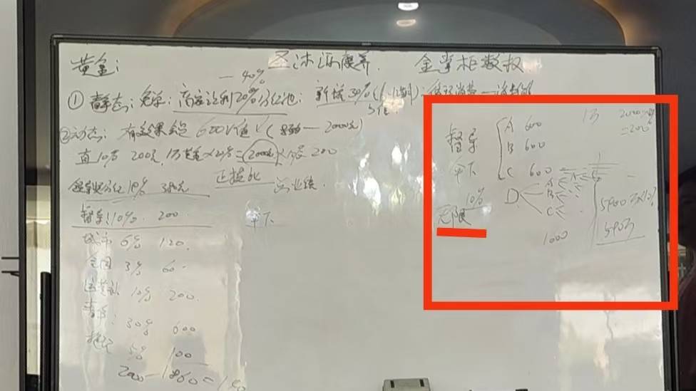 还有“督导奖”:“你要有ABC三个人,每个人都是一个合格的会员,这时候你就是一个督导了,在这个过程中你要培养一条线,让一条线成功成活,第四个你就可以见点拿10%了,只要是你伞下的ABC你都拿,然后D的D就不拿了,这是三条线之内的无限层无限代,我们见点就拿他的10%,拿1万黄金为例,商家让利2000元的10%是200元,只要来一个见点就是200元。十层之内不说是2000了,就算是1000的话就是5900万,10%就是590万。”