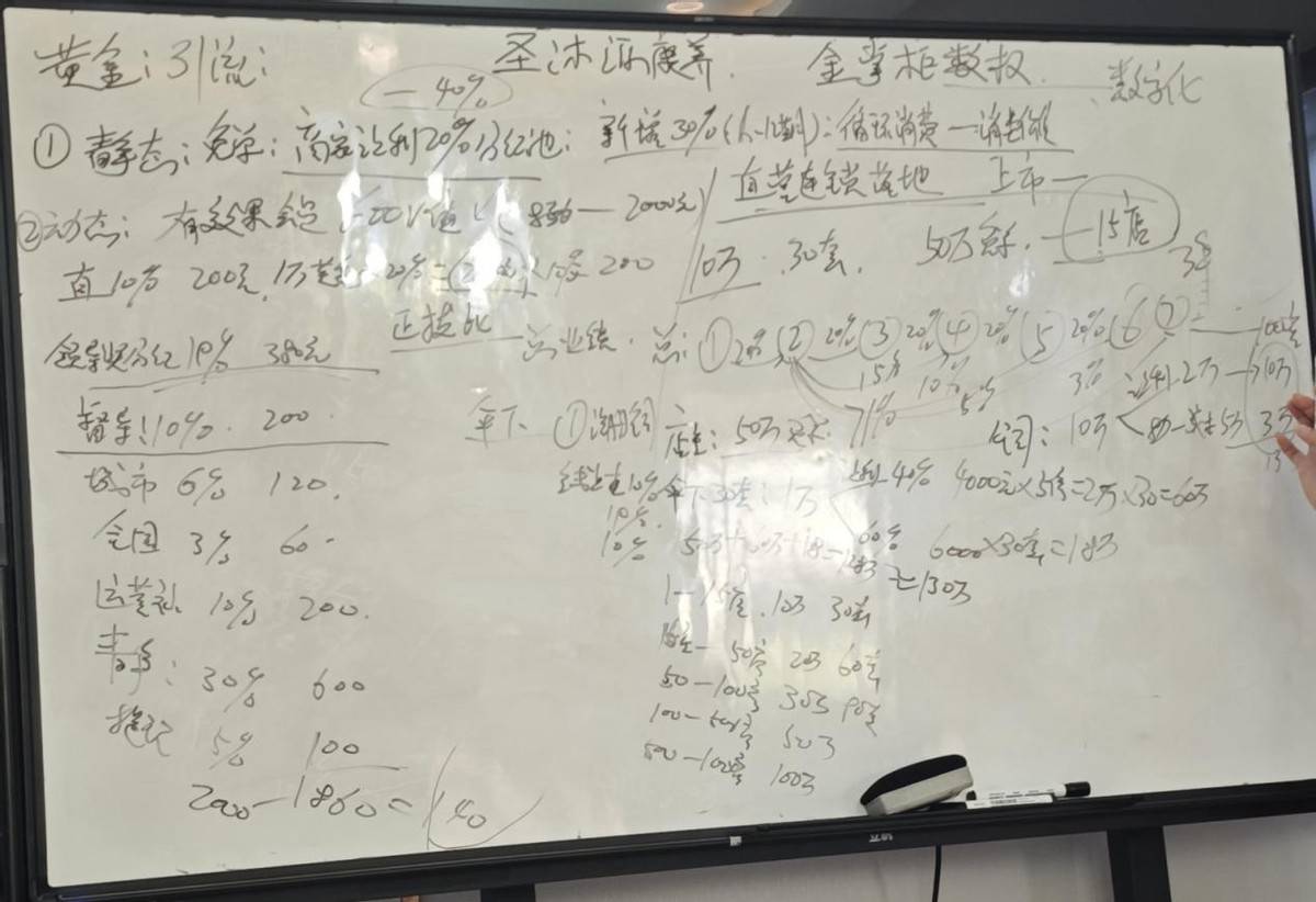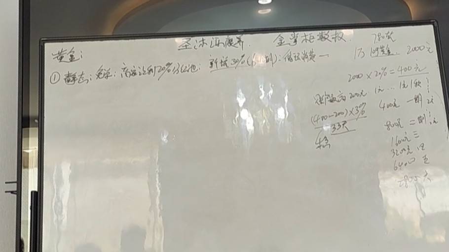 关于盈利模式,讲师直言:“为什么要起模式?起模式是搂钱的!首先公司要把泡浴这个事儿,通过这个模式来大量的流量,让它直营店落地,变成真实的复购。然后从而我们上资本市场。我们也是以黄金引流,我们的静态是免单。商家让利20%放在分红池给大家分,新增业绩的30%给大家来分,直到免单。多长时间?六到十二期,免单之后出来的钱,我们可以循环消费。一万块钱买了10克黄金,静态部分拿出30%给你分,2000先出来20%(就是400元)放在底池里,每个账户只能进200元,剩下200是以每天3%的速度往分红池里释放,33天释放完了。假如说一个人不进,我们可以稳稳走33天,每个人照常可以免单,可以分出来。”