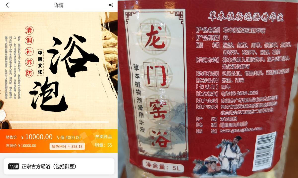 据悉,该泡浴产品为“草本植物泡澡精华液”,在金掌柜商城售价1万元一次,用量为两桶(每桶5L),配料包含独活、红花、川芎等,注意事项标注“只限外用,切忌内服,酒精过敏者慎用”。其生产企业为南阳市广寿保健品有限责任公司,从经营范围来看,该公司并不具备生产药品的资质。山东金掌柜圣沐源康养公司宣传产品“杀死癌细胞”等内容,违反《广告法》相关规定,涉嫌虚假宣传。