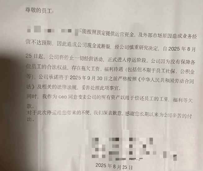 公开信还表示,公司存在拖欠员工工资等情况,承诺在2025年9月30日前妥善处理,并且CEO同意变卖公司所有资产用于偿还员工工资等各项欠款。