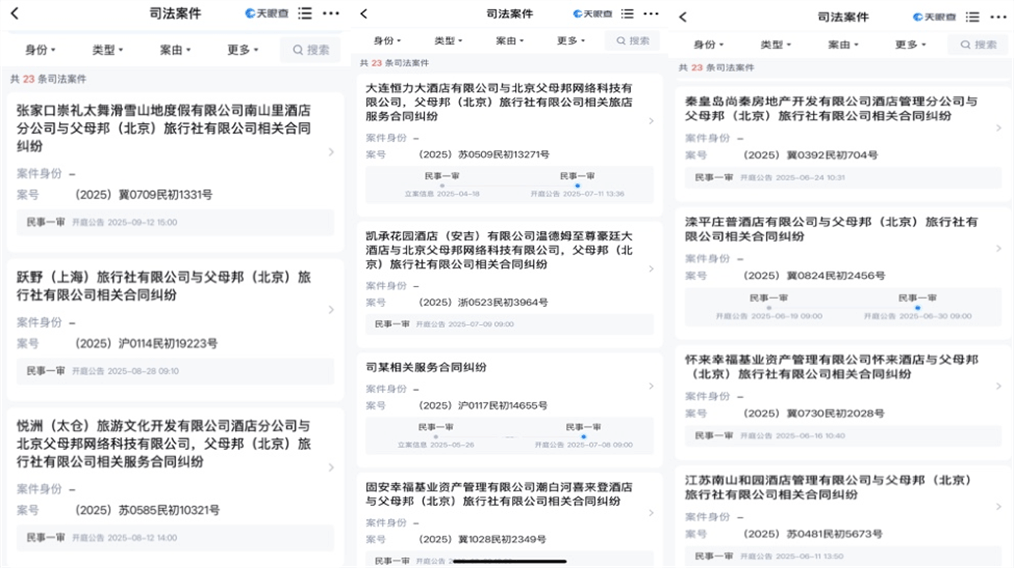 天眼查显示,2025年父母邦旅行被多家旅游供应商告上法庭,包括大连恒力达酒店有限公司、凯承花园酒店(安吉)有限公司温德姆至尊豪庭大酒店、滦平庄普酒店有限公司等数十家旅游企业。