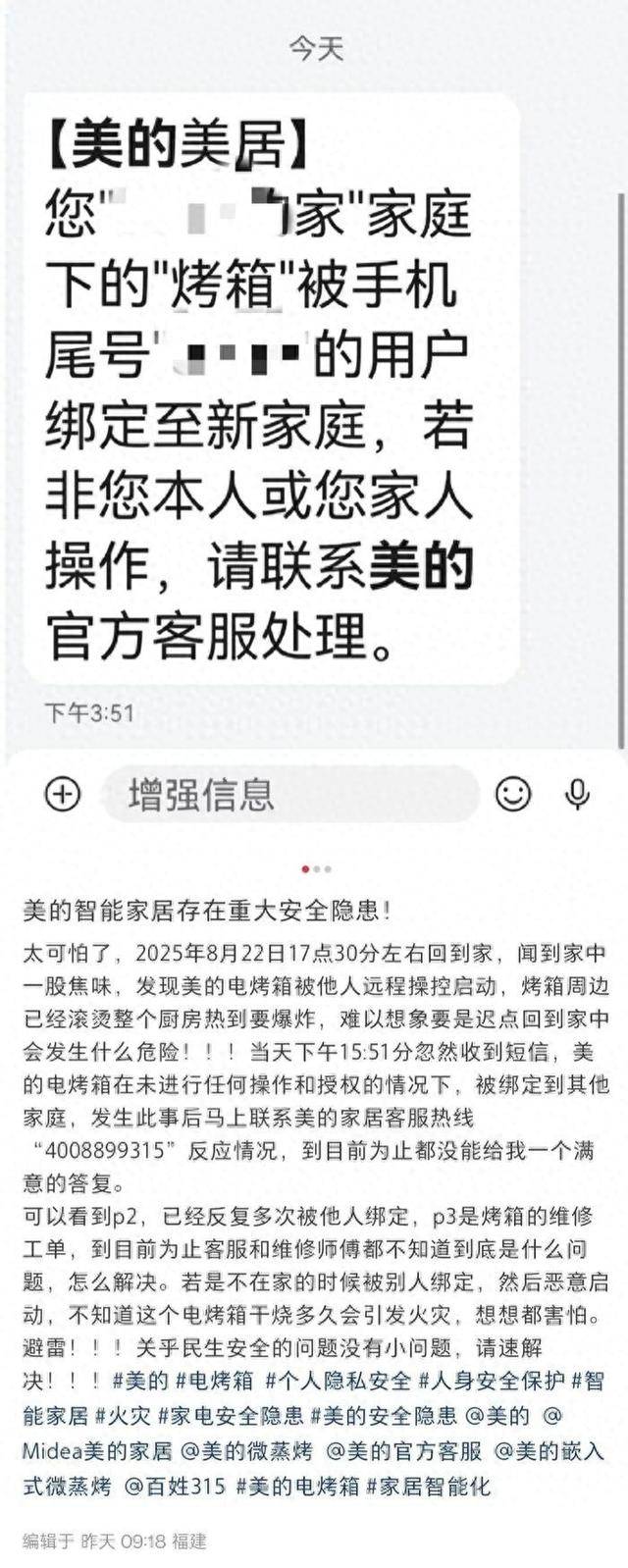 “现在情况是陌生人可以操控我家电烤箱,不仅是侵犯个人隐私,还存在严重的安全隐患。”该网友还贴出了自己当天收到的换绑新用户验证短信截图。记者注意到,美的官方客服账号也出现在网帖下方评论区,表示正在跟进此事。