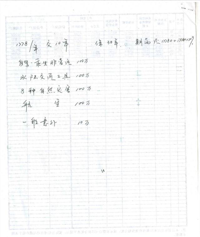 在该保障计划最后一页(第3页)背面,手写着“1778/年 交10年 保30年 期满还17780+17780×20%”,以及“自驾、乘坐非营运 100万 水陆交通工具 100万”等。
