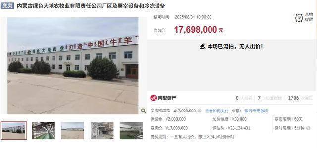 2025年8月31日,绿色公司的厂区及屠宰设备和冷冻设备等资产,在阿里法拍平台上为期60天的变卖结束。这些资产两年来已六次进行法拍,价格从2313万元降至1769.8万元,但这次变卖依然无人问津。