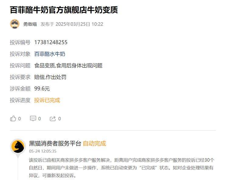 另一消费者也投诉百菲酪的质量存在问题。该消费者于2025年2月8日在拼多多平台店铺名称“百菲酪牛奶官方旗舰店”购入生产日期为2025年1月5日生产保质期六个月的规格200ml×30盒部分脱脂灭菌乳,在3.25保质期内有一盒牛奶出现外表无挤压内里变质粘稠有固状物,不知情状态下喝了一大口半小时左右上吐下泻,询问该客服称变质是因为运输中挤压导致属于正常现象。