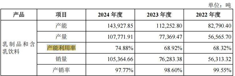 但值得注意的是,百菲乳业的产能利用率并不高。从2022年至2024年(以下简称报告期),该公司的产能利用率分别为68.32%、68.92%和74.88%,产能利用率在上升,但仍然低于八成。