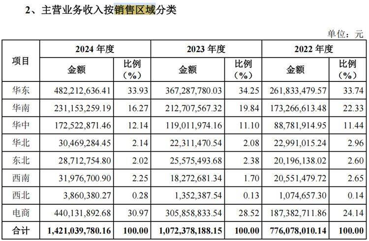 但值得注意的是,百菲乳业的销售区域较为单一。报告期内,该公司的销售区域主要集中于华东、华南、华中地区,上述区域销售额占公司主营业务收入的比例分别为67.51%、65.19%和62.34%。由此可见,该公司超过六成的收入来自三个区域,销售区域较为单一。
