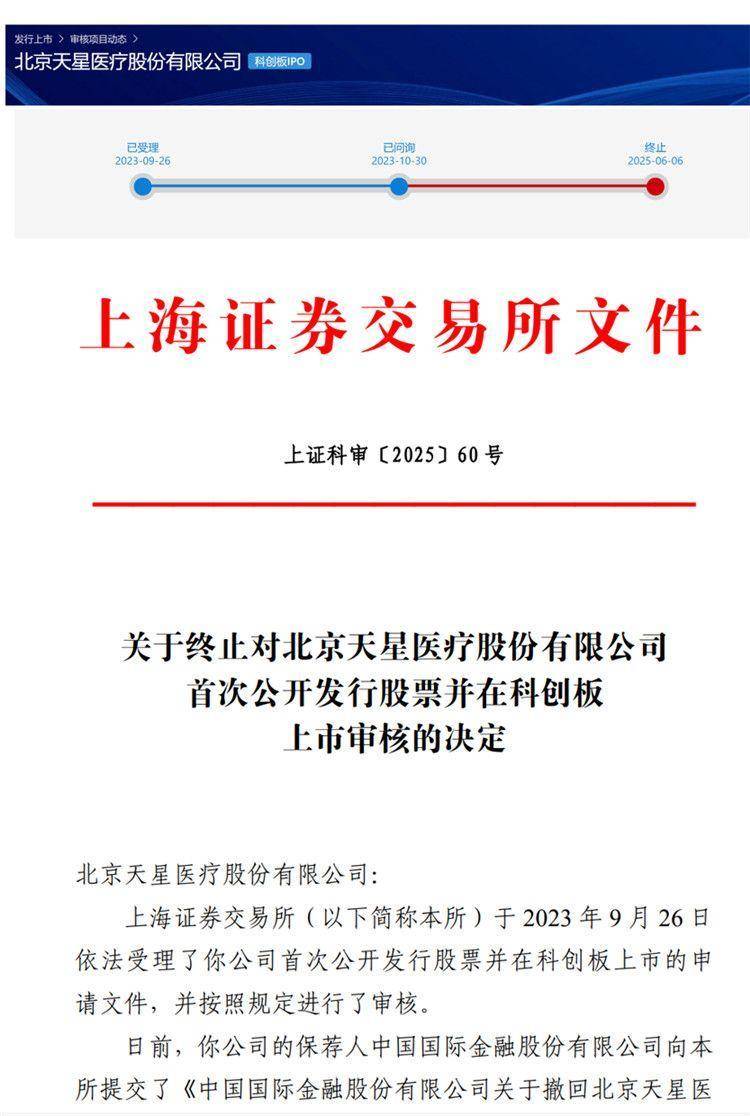 天星医疗曾于上交所科创板提交上市申请,2023年9月,上交所受理该公司招股书。但在更新过一版招股书后,天星医疗的保荐机构中国国际金融股份有限公司选择撤回申请,2025年6月上交所终止了该公司的审核进程。