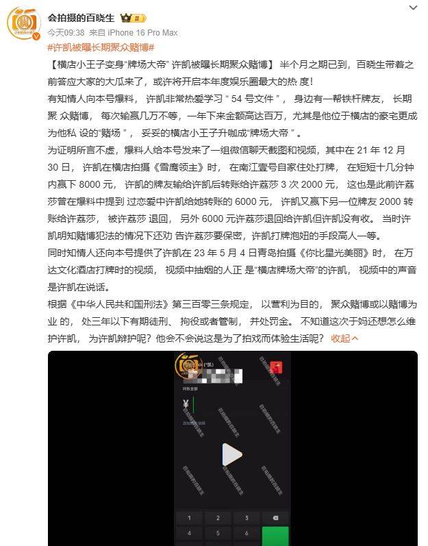 9月8日,话题#许凯横店豪宅私设赌场##许凯被曝长期聚众赌博#登上微博热搜。