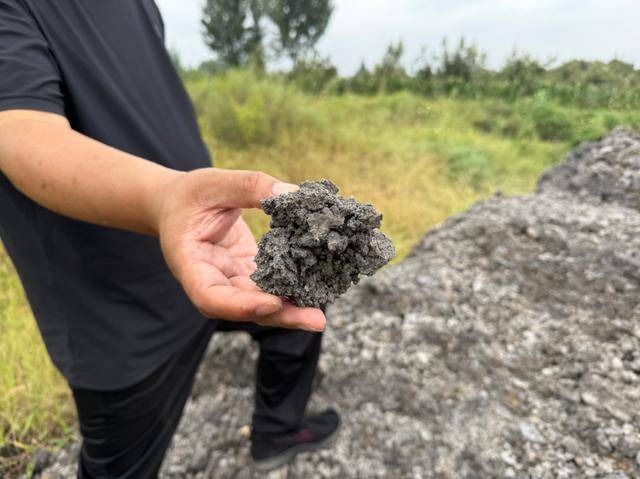 南小庄村也有被倾倒的矿渣,记者在村南侧村民所说的“采砂坑”里看到一些黑色泛白、泛绿的矿渣,还有部分堆放在坑边。一名村民表示自己以前长期从事铁矿相关工作,认为泛白的矿渣可能是“硫酸渣”。