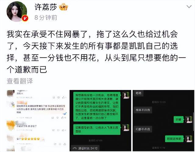 随后@许荔莎 发文表示:我实在承受不住网暴了,拖了这么久也给过机会了,今天接下来发生的所有事都是凯凯自己的选择,甚至一分钱也不用花,从头到尾只想要他的一个道歉而已!