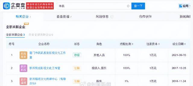 据企查查信息显示,许凯名下关联3家公司,注册资本均为1万元,当前仅厦门市凯凯发发影视文化工作室存续。值得注意的是,其曾持有新沂福将文化传媒中心(有限合伙)1%股权,该公司执行事务合伙人为欢娱影视股东、经理杨银凤,欢娱影视旗下艺人白梦妍(白鹿)同样持股1%,该公司已于2020年12月注销。