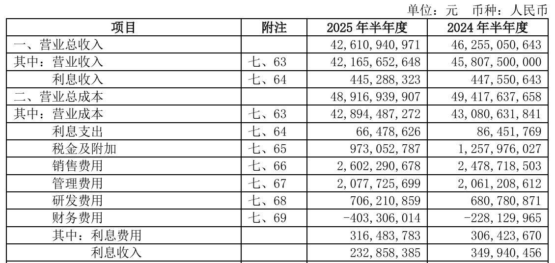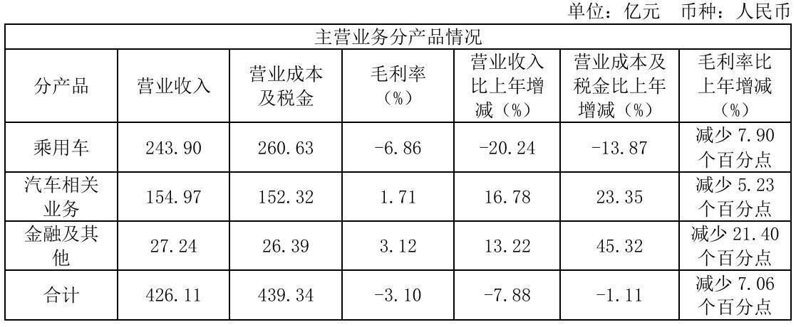 根据财报,2025年上半年,广汽集团合并口径的总收入为426.11亿元,同比下滑约7.88%;其中乘用车收入243.90亿元,同比下滑20.24%,且乘用车毛利率较上年同期减少7.9个百分点至-6.86%。