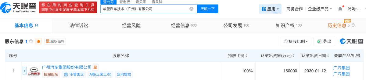 天眼查App信息显示,华望汽车(全称为“华望汽车技术(广州)有限公司”)成立于2025年3月。目前,该公司的注册资本为15亿元,法定代表人为閤先庆,全资股东为广汽集团。