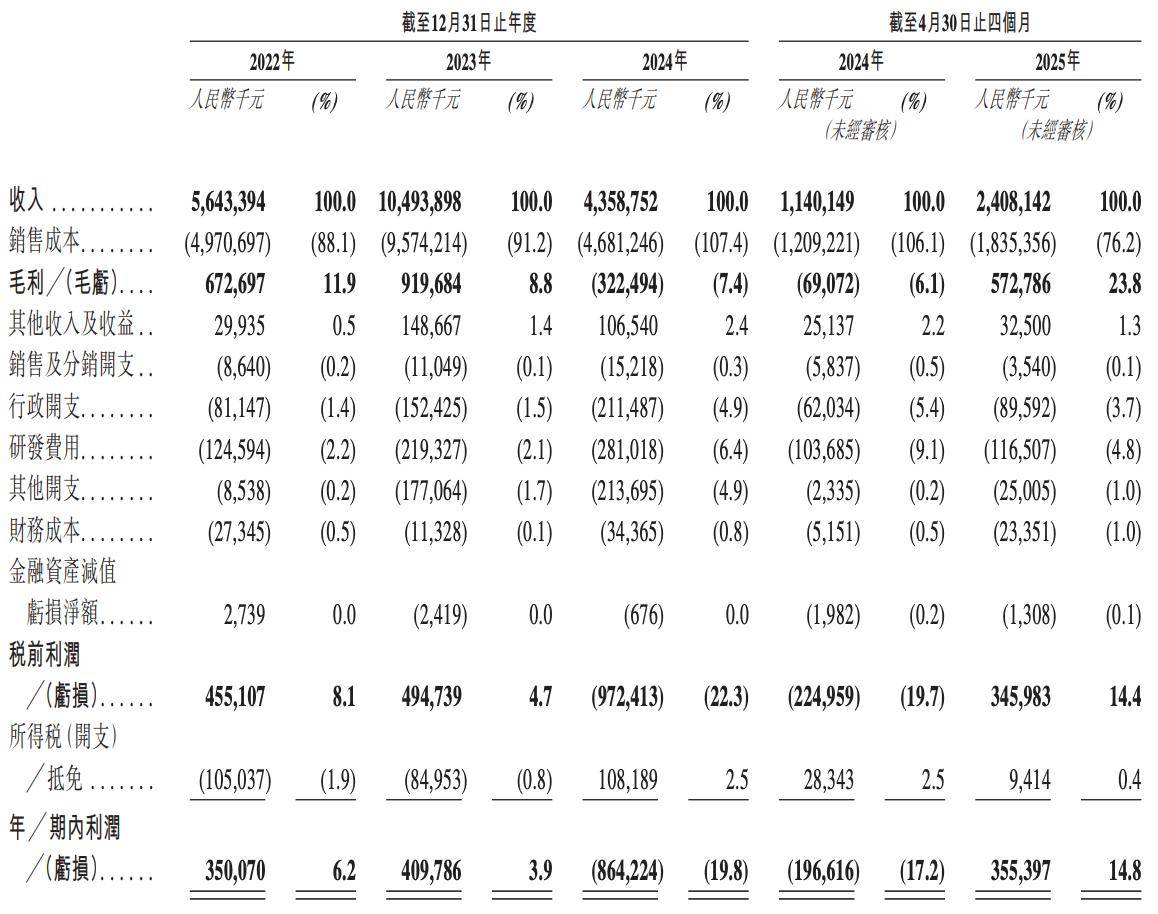 2025年前4个月,英发睿能的毛利约为5.73亿元,由负转正。同时,该公司的毛利率升至23.8%。2025年前4个月,英发睿能的净利润约为3.55亿元,而2024年同期则为净亏损约1.97亿元。