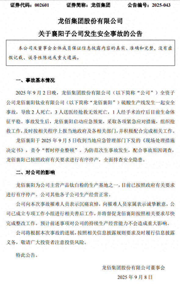 公司表示,龙佰襄阳于2025年9月5日收到当地应急管理部门下发的《现场处理措施决定书》,责令“暂时停业整顿”。为防范次生事故发生,配合事故原因调查,龙佰襄阳已按照政府有关要求进行有序停产,全面排查安全隐患。