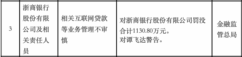 因相关互联网贷款等业务管理不审慎,浙商银行被罚没合计1130.80万元。