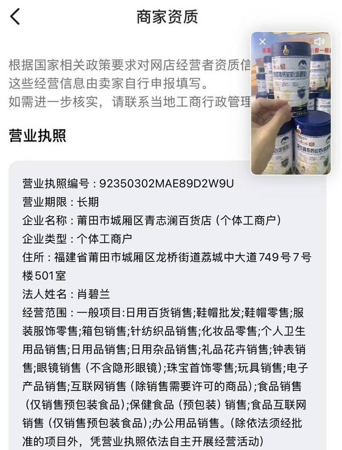 直播间销售主体为莆田市城厢区青志澜百货店(个体工商户),法人肖碧兰,经营范围含“保健食品(预包装)销售”,但该店铺因“登记住所无法联系”被列入经营异常名录。法律人士指出,这种“注销企业+异常个体户”的组合模式,或为逃避监管责任,消费者维权将面临主体认定难题。