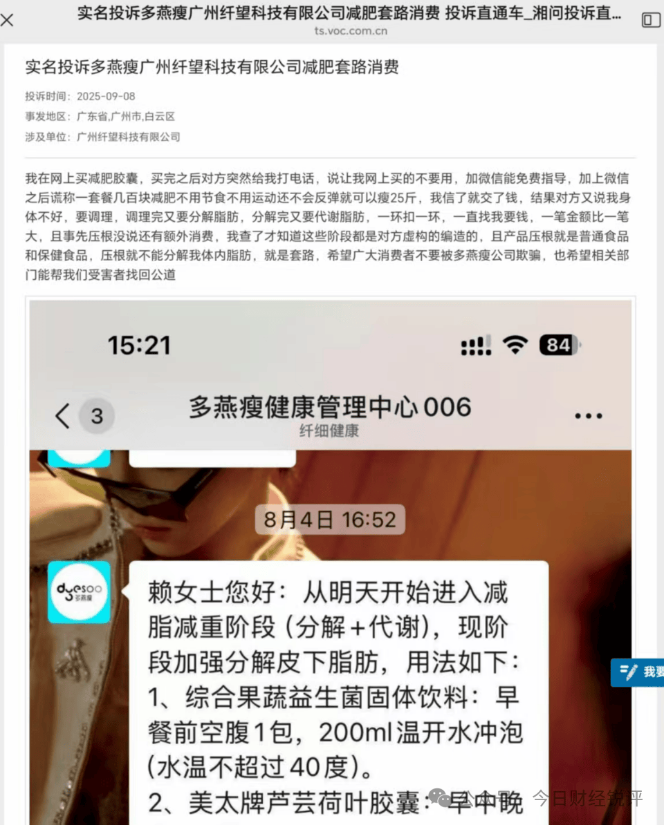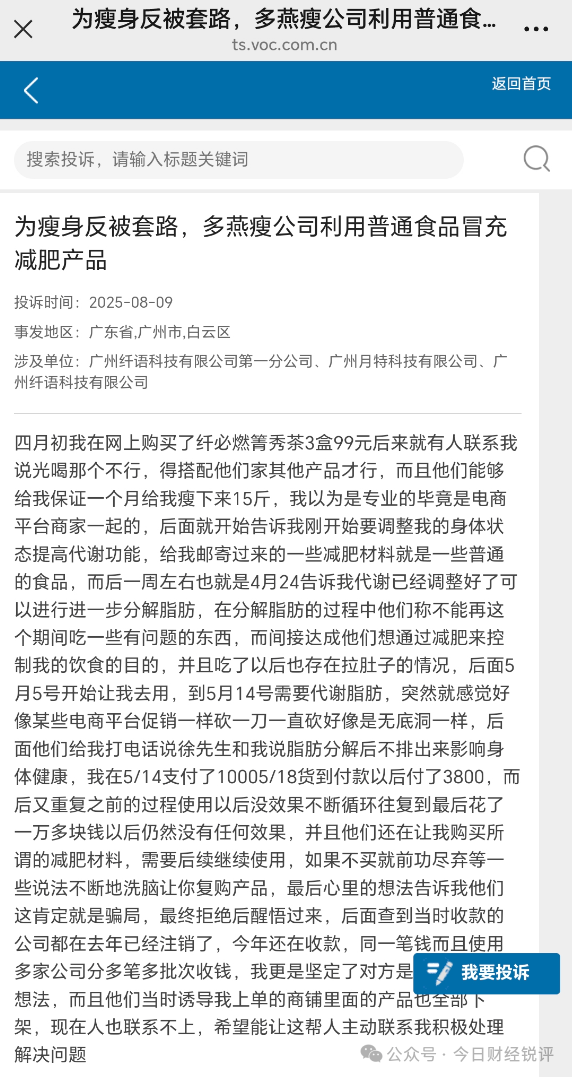 在黑猫投诉平台上,相关投诉多达数百条,众多消费者讲述着相似的经历:起初被“轻松减肥、不反弹”“专业指导、科学瘦身”等宣传语吸引,购买基础产品后,所谓的“专业顾问”便以消费者体质特殊、当前产品效果不佳等理由,不断诱导其购买高价套餐,从几百元逐步升级到数万元。