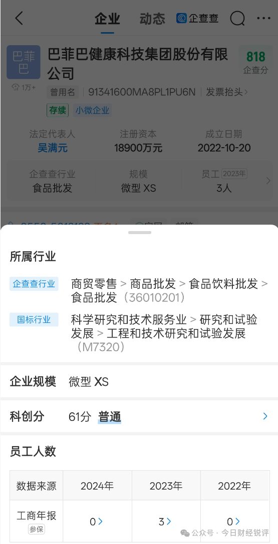 从多燕瘦与BFB集团的股权穿透来看,多燕瘦健康科学有限公司唯一控股股东为巴菲巴健康科技集团股份有限公司,该公司成立于2022年10月20日,注册地址位于安徽省亳州市。工商年报信息显示该公司2023年参保人数3人,2024年0人。