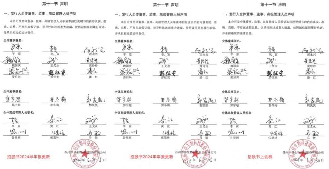 对比公司招股书2024半年报更新版、2024年报更新版及上会稿三份文件,发现“发行人全体董监高声明”页存在明显异常,三份文件的签署时间分别为2024年12月5日、2025年6月25日及2025年7月30日,间隔最长达7个多月。按照商业文书签署的基本常识,不同时间、不同场景下的亲笔签名,必然会在笔墨轻重、笔画力度、签名位置、字体倾斜角度等方面存在细微差异。