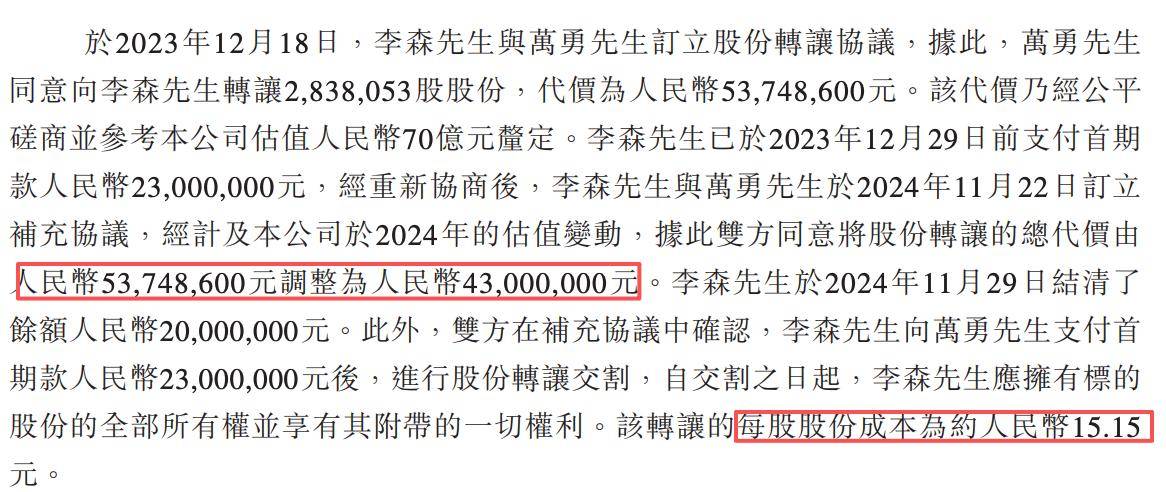 另在2023年12月,万勇向李森转让金晟新能2,838,053股股份,代价约为5375万元,对应公司估值70亿元。其中,李森已2023年12月支付首批款2300万元。但在2024年11月的补充协议以及金晟新能2024年估值变动,该笔转让的价格调整为4300万元。