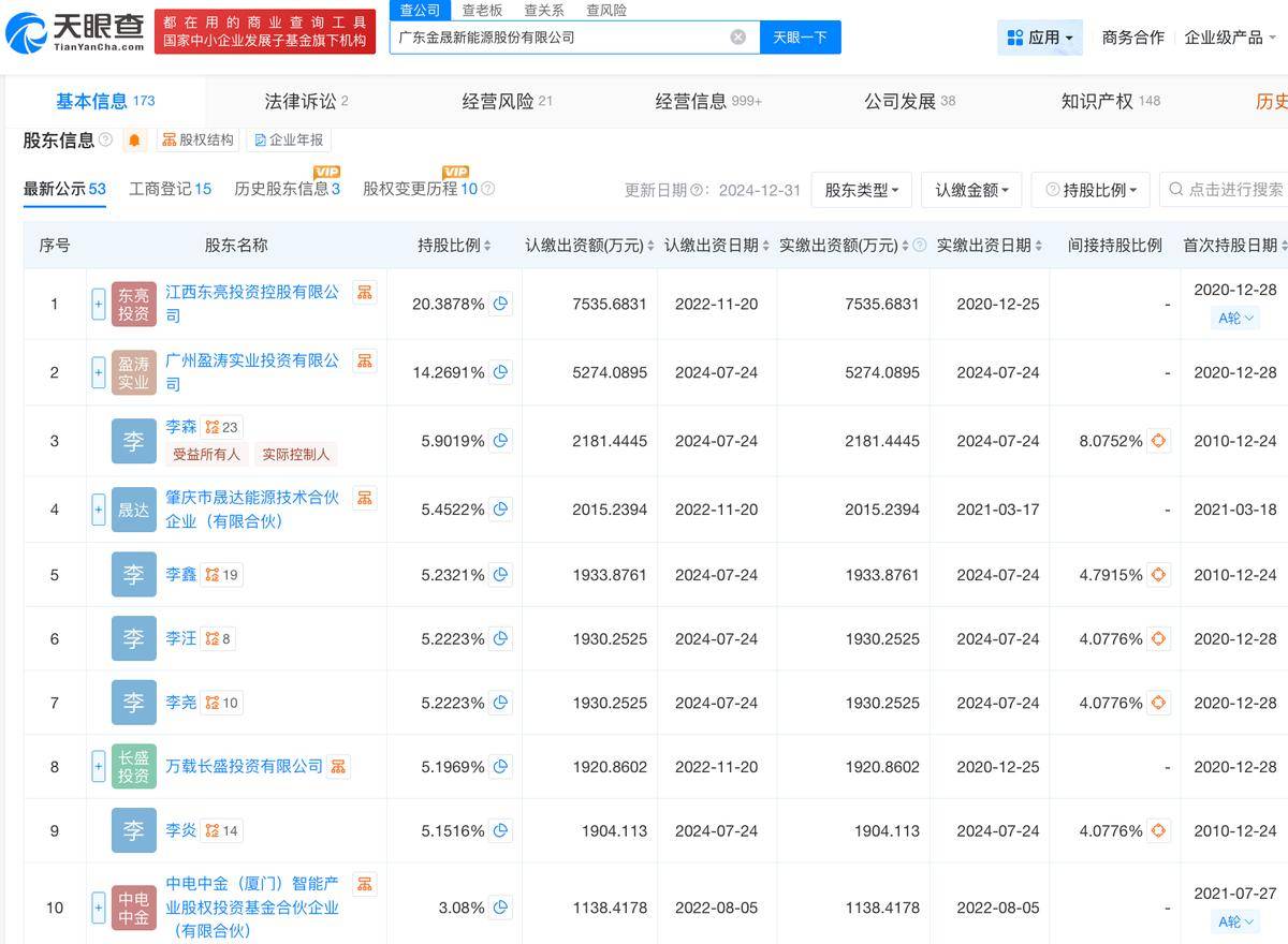 天眼查App信息显示,金晟新能成立于2010年12月,位于广东省肇庆市。目前,该公司的注册资本约为3.75亿元,法定代表人为李森,主要股东包括江西东亮投资控股有限公司(下称“江西东亮”)、广州盈涛、李森等。