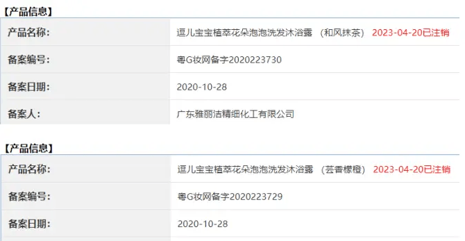 不仅如此,逗儿品牌还存在虚假宣传和涉嫌生产销售已注销备案产品的问题。上述两款洗发沐浴露曾宣传“0岁+适用”,但经查询,这两款产品的备案均于2023年4月20日已注销,无法查询其使用人群,因此该宣传没有法律依据。