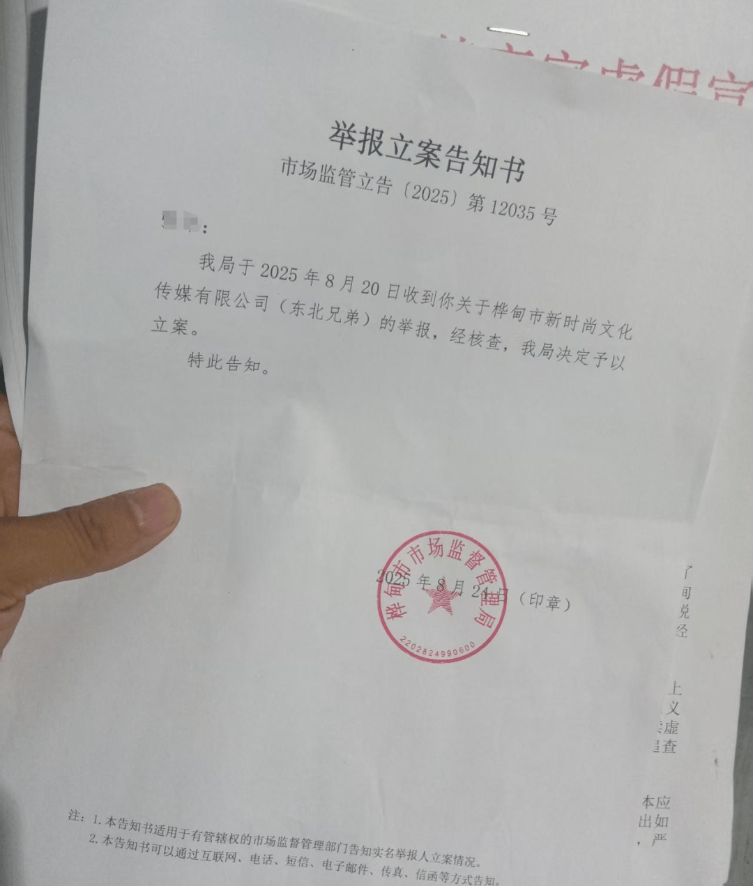 今年8月24日,桦甸市市场监管局接到13家灵芝种植户的联名举报后,下达了《举报立案告知书》,决定对桦甸市新时尚文化传媒有限公司(东北兄弟)立案调查。