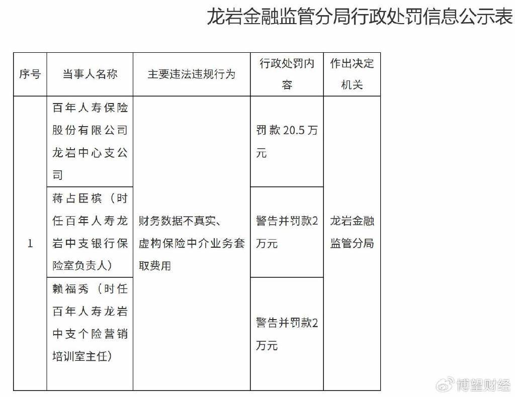 2025年9月1日,据龙岩金融监管分局公开的行政处罚信息显示,百年人寿龙岩中心支公司因财务数据不真实、虚构保险中介业务套取费用被罚款20.5万元,时任龙岩中支银行保险室负责人蒋占臣槟、龙岩中支个险营销培训室主任赖福秀被警告并分别罚款2万元。