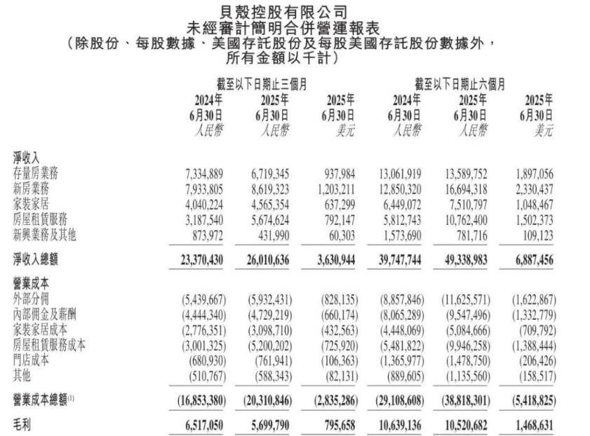 贝壳找房,作为房地产中介领域的头部企业,也不可避免地受到环境的影响,其利润状况备受关注。2025年上半年,贝壳找房的营收为493.4亿元,同比增长24.1%,但净利润为21.6亿元,同比下降7.2%。