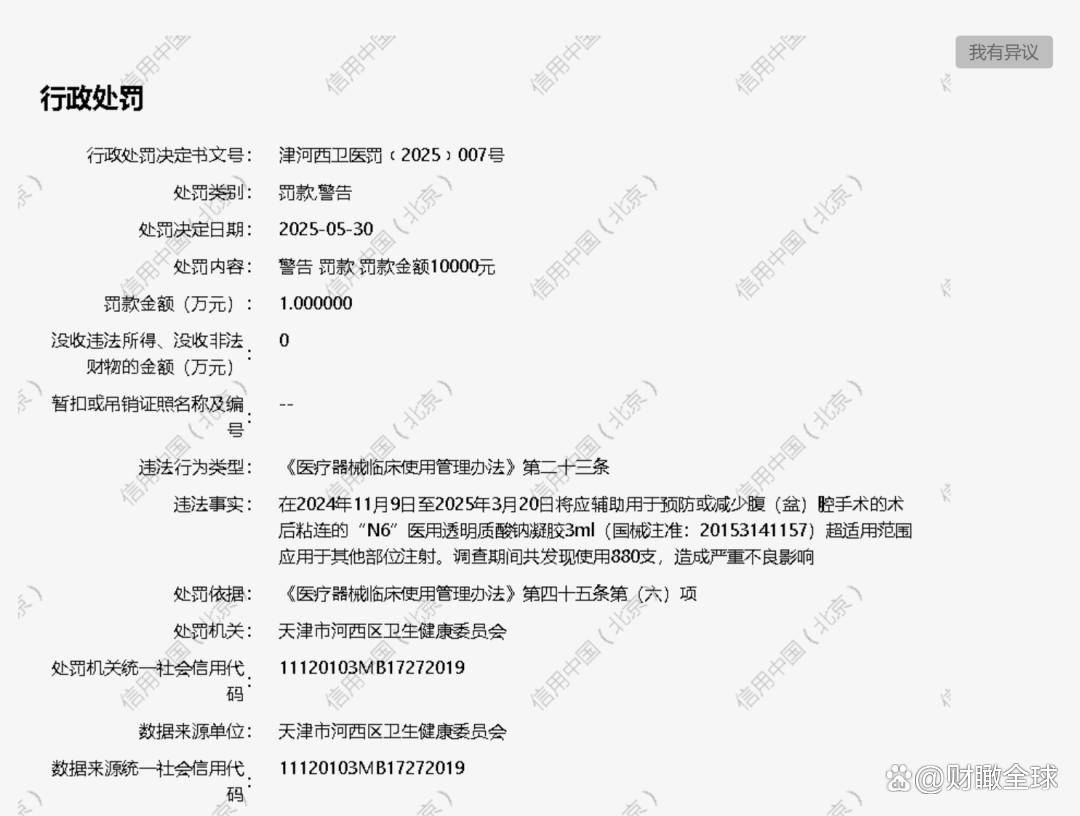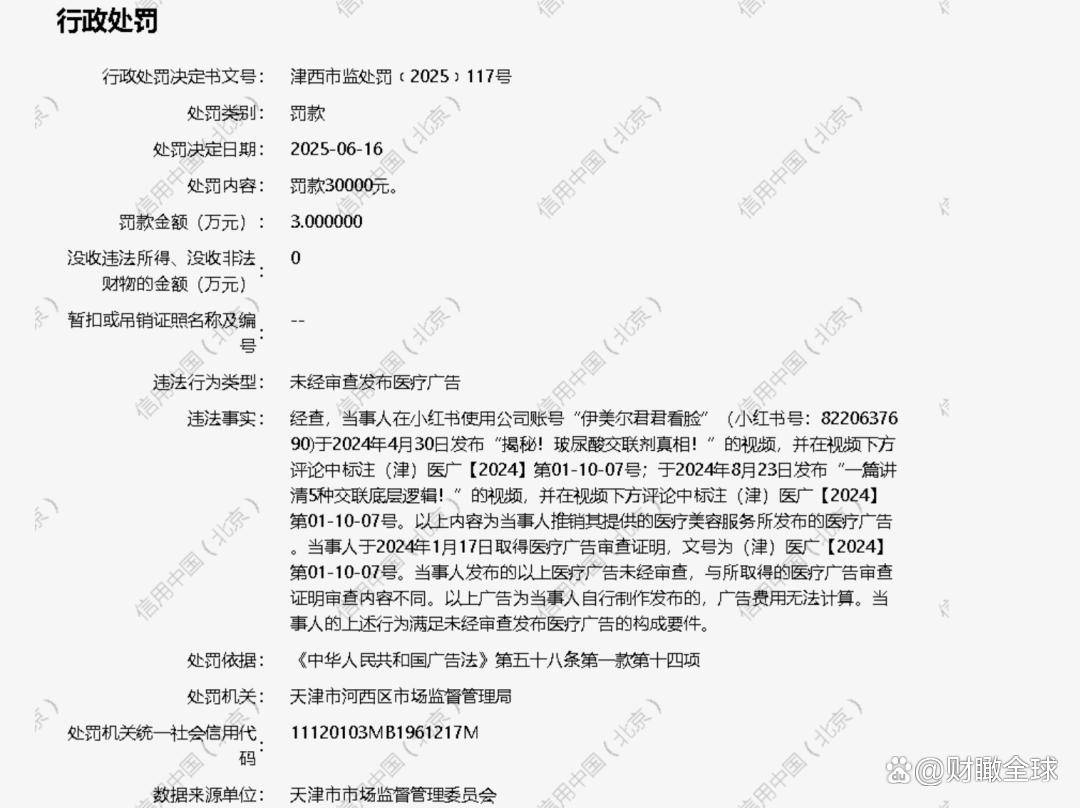 信用中国信息显示,5月30日,天津市河西区卫生健康委员会下达行政处罚决定书[文号:津河西卫医罚(2025)007号],对天津伊美尔医疗整形美容专科医院有限公司警告,罚款10000元。