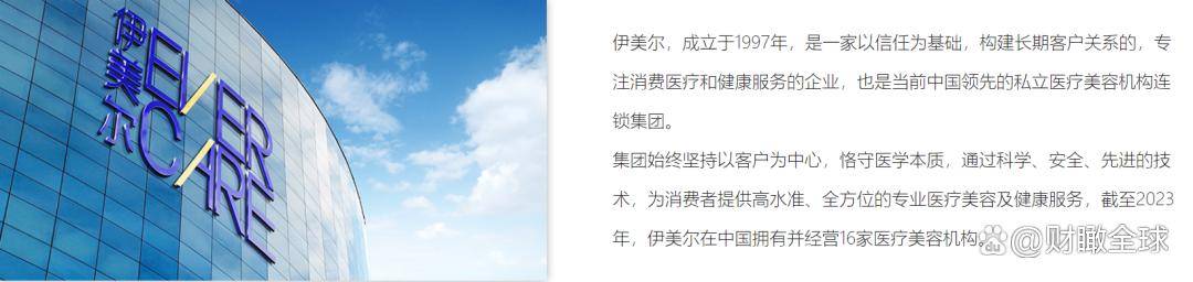 据伊美尔官网介绍:伊美尔,成立于1997年,是一家以信任为基础,构建长期客户关系的,专注消费医疗和健康服务的企业,也是当前中国领先的私立医疗美容机构连锁集团。截至2023年,伊美尔在中国拥有并经营16家医疗美容机构。