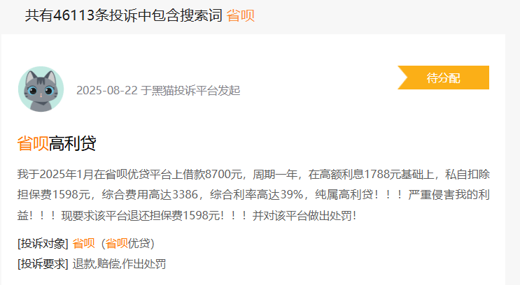 举例来看,有用户称其“于2025年1月在省呗优贷平台上借款8700元,周期一年,在高额利息1788元基础上,私自扣除担保费1598元,综合费用高达3386,综合利率高达39%,纯属高利贷!”