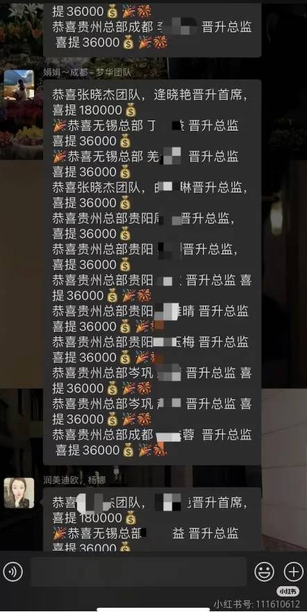 在某润美迪欧的群里,但凡有人员晋升,团队都发来恭喜祝贺信息,从流传的截图来看晋升总监喜提3600元、晋升首席喜提180000元。不过,真实性无法判断。