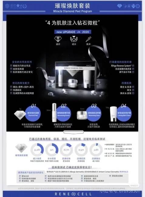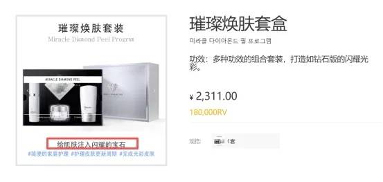 润美迪欧宣称以微生物控制技术、天然成分提取及低刺激高渗透配方为核心竞争力,产品可作用于肌底细胞修复受损的DNA,让细胞焕发新生。不仅增强了细胞的排毒能力,还改善了细胞的年轻态,使肌肤呈现出饱满充盈的状态,具有“抗衰、提拉、治疗”等功效,更神奇的是“种钻石”项目俘获不少女性。