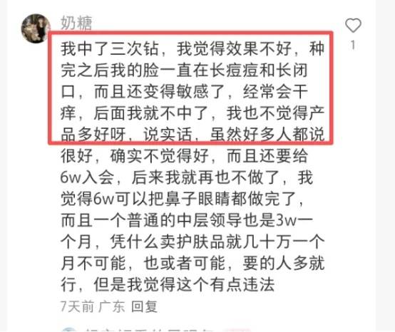 在网上,有多位用户称自己使用润美迪欧的脸上种钻石套餐后,出现过敏、红肿现象,反反复复。一位小红书博主也分享了自己使用润美迪欧钻石护肤的遭遇:种了三次钻,脸上一直长痘痘和闭口,而且皮肤变得敏感了,经常干痒。