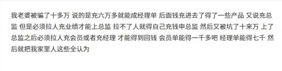 网上有多篇控诉润美迪欧骗局的贴子,还有网友称自己老婆被润美迪欧骗了十多万,“说充六万多能成经理单,后面钱充进去得了一些产品。又说充总监,但是必须拉人充业绩才能上总监,拉不了人就得自己充钱升总监,然后又被坑了十来万。上了总监之后必须拉人充会员或者充经理才能得到回钱,会员单能得一千多吧,经理单能得七千。”