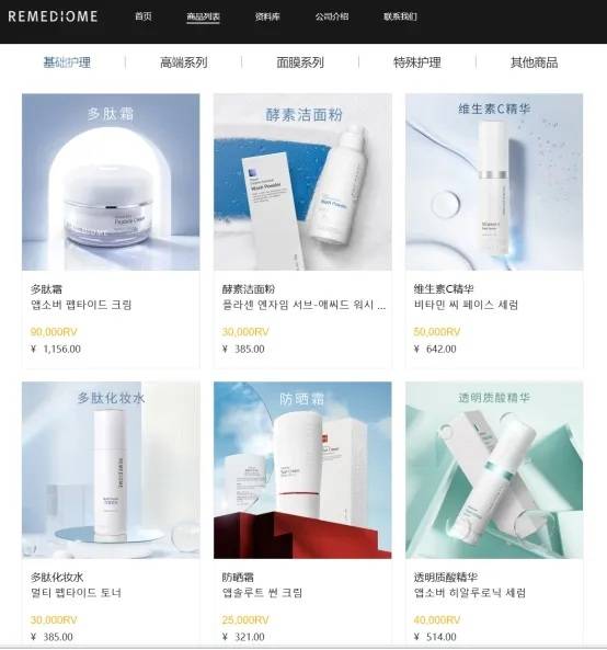 记者看到,润美迪欧的产品分为基础护理、高端系列、面膜系列,特殊护理等四大板块,基础护理主要有酵素洁面粉、维生素C精华、多肽霜等,售价普遍在几百元,高端系列焕肤奢华面霜、焕肤奢华精华售价分别为1156元、2311元。特殊护理的雪颜祛斑霜价格为963元、璀璨焕肤套盒为2311元。