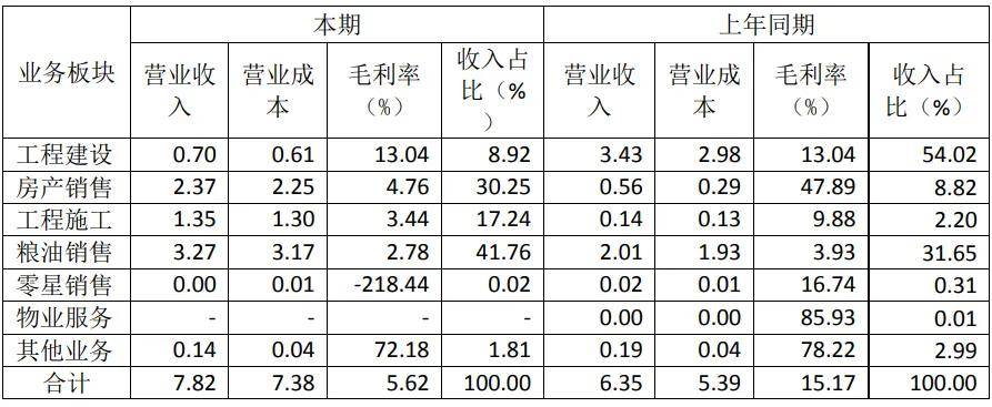作为公司核心业务的工程建设板块,当期营业收入仅0.70亿元,同比锐减79.59%,主要因承接的基建项目数量大幅减少。