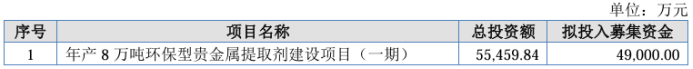 此次IPO,公司拟募资4.9亿元,全部用于年产8万吨环保型贵金属提取剂建设项目(一期),与此前递表深主板的招股书相比,公司砍掉了研发中心建设项目、营销网络建设及品牌推广项目以及补流项目,募资额由4.5亿元增加至4.9亿元。具体来看,虽然北交所砍掉了此前7000万元的补流,但在此次北交所的扩产项目中,仍拟募资1.5亿元用于铺底流动资金。
