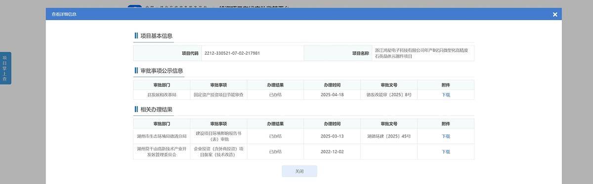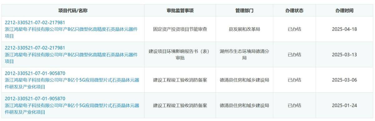 德清项目包含两期建设内容,一期建设项目名称为“浙江鸿星电子科技有限公司年产8亿个5G应用微型片式石英晶体元器件研发及产业化项目”(下称:一期项目),二期项目名称为“浙江鸿星电子科技有限公司年产8亿只微型化高精度石英晶体元器件项目”(下称:二期项目),一、二期项目均已备案并取得环批复。