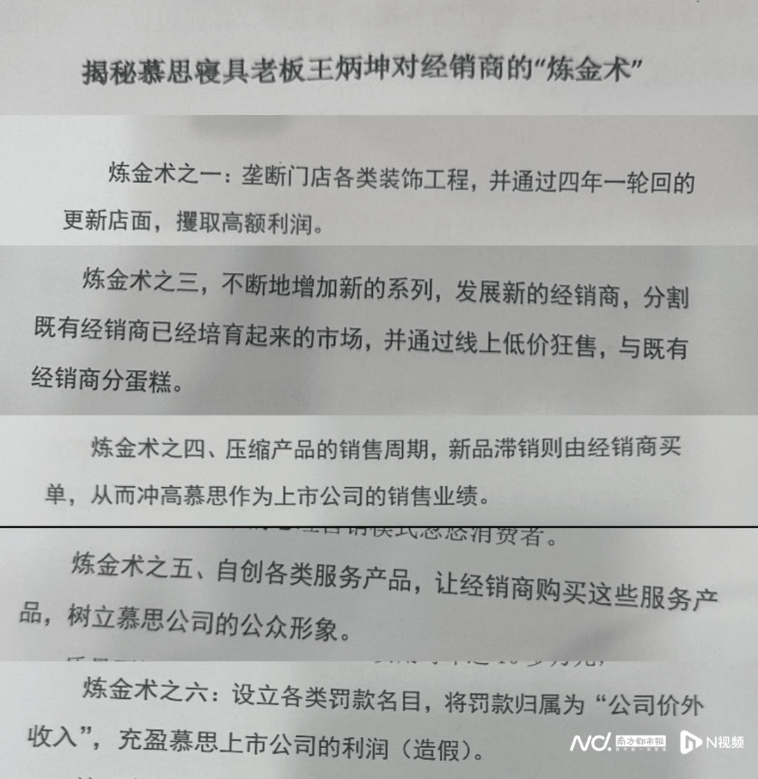 8月以来,几名来自江苏、重庆的慕思经销商、前经销商,对南都N视频记者投诉称,慕思股份通过要求经销商定期更新门店装修,攫取利润,对经销商实施末位淘汰;设立各种罚款名目,将罚款归属为“价外收入”,利润造假等。