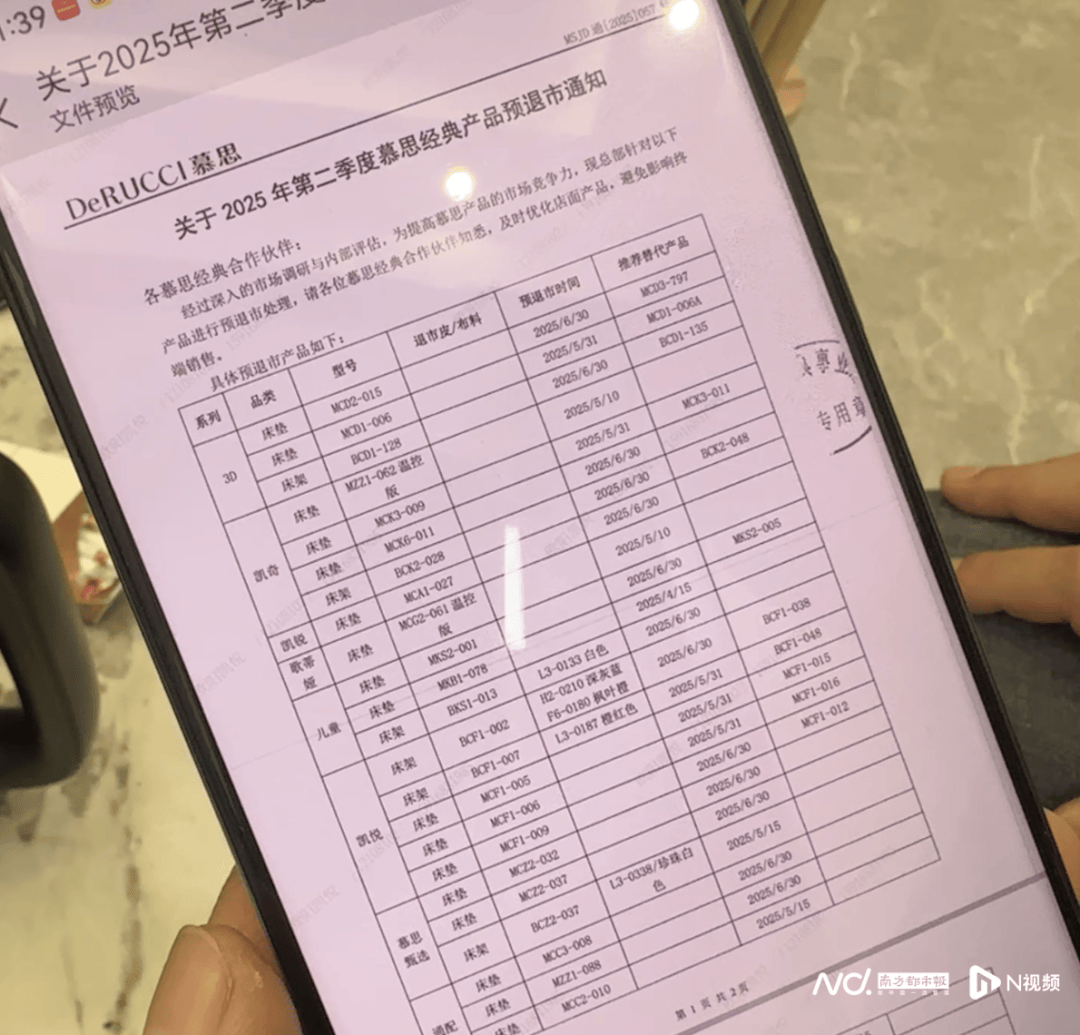 根据孙先生提供的资料,2025年的二季度,每个月他都收到了慕思发来的退市的产品清单,其中5月有二十多款,包含各种类型的床垫、床头柜、家纺等。
