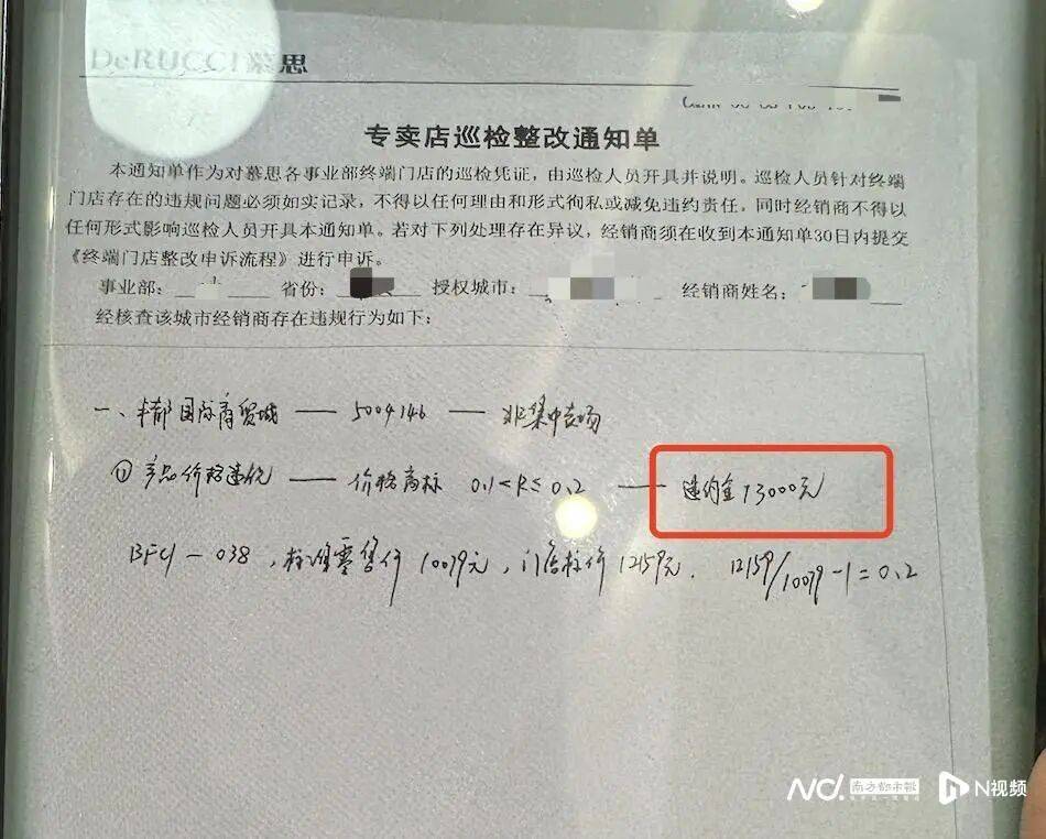 前经销商李女士提供的一张2024年8月的《专卖店巡检整改通知单》显示,她因为价格违规,被罚款13000元。她补充,这只是标错了价格,并非实际售价,却被慕思进行了罚款。