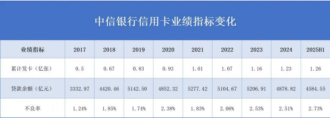 作为头部发卡行之一,中信银行信用卡近七年以来经历了较为显著的规模降速和业绩降速。至2025年上半年,中信银行信用卡的贷余规模已跌至六年前,不良率也创下近年新高。
