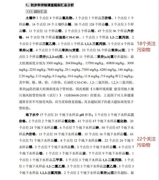 其中一份报告显示,发现土壤中苯并(a)芘、苯并(a)蒽、苯并(b)荧蒽、茚并(1,2,3-cd)芘和二苯并(a,h)蒽、1,2-二氯丙烷、1,2,3-三氯丙烷、氟化物、铜、 锑、锌、钴、镍、六价铬、石油烃(C10-C40)、铅的含量均超过了人体可接受水平;地下水中三氯乙烯、1,2-二氯丙烷的含量超过了人体可接受水平。