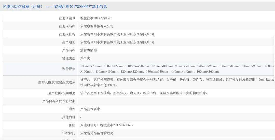 记者依据该编号在国家药监局官网查询发现,该产品实际成分为远红外陶瓷粉、载体胶及高分子聚合物与无纺布、白平布、肤色布、弹性布、防粘纸组成,生产企业为安徽康源药械有限公司。