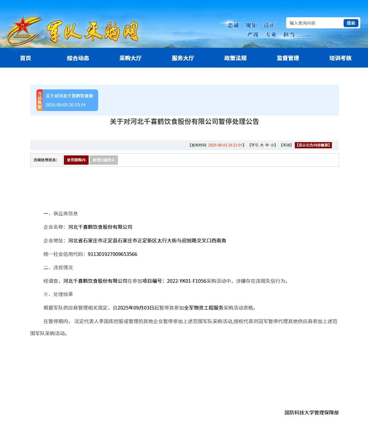探针财经从军队采购网获悉,2025年9月3日,国防科技大学管理保障部发布关于对河北千喜鹤饮食股份有限公司暂停处理公告。